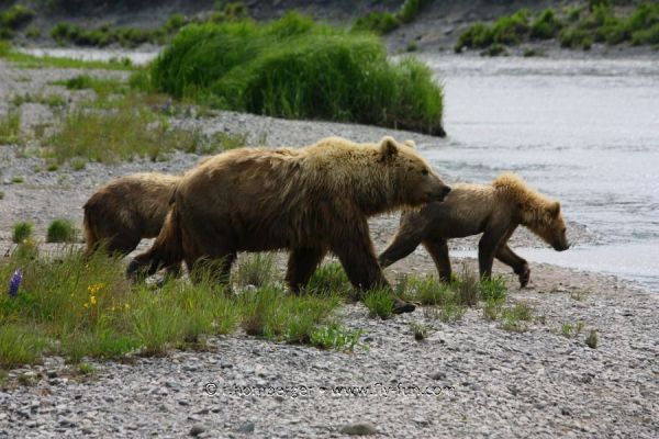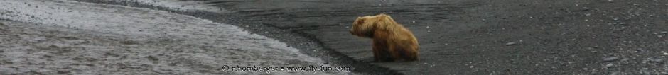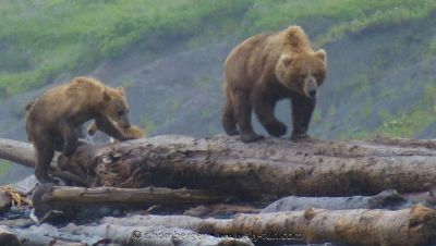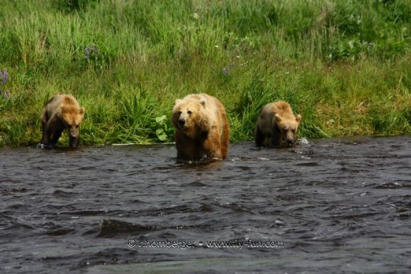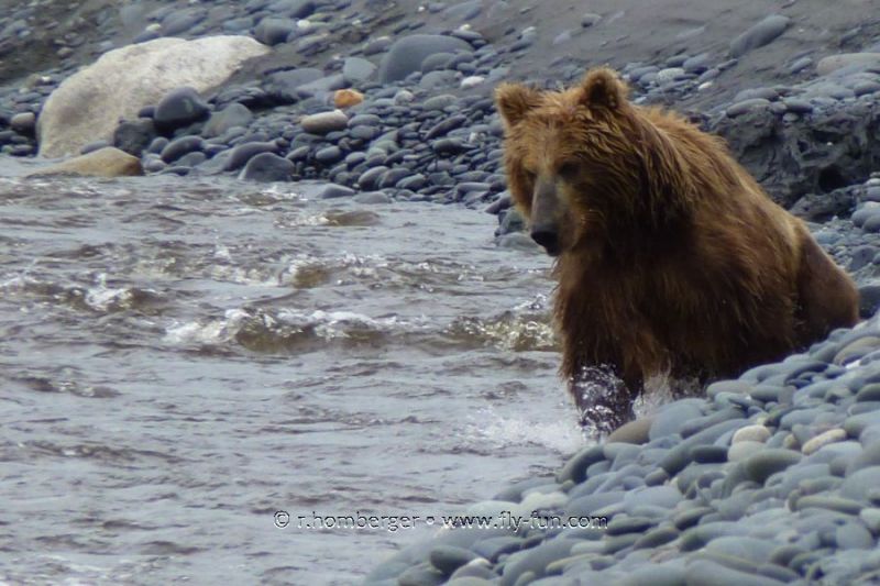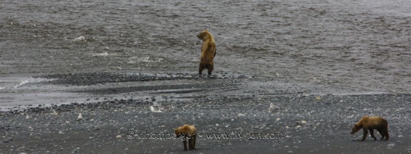 Am nächsten Tag besuchen uns die Bären bei der Zählstation. Plötzlich stehen sie vor uns, begutachten die Wurfkünste und ziehen sich (kopfschüttelnd?) über den Fluss zurück.
